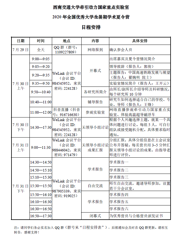 "交通强国 动力牵引"2020年全国优秀大学生暑期学术夏令营日程安排