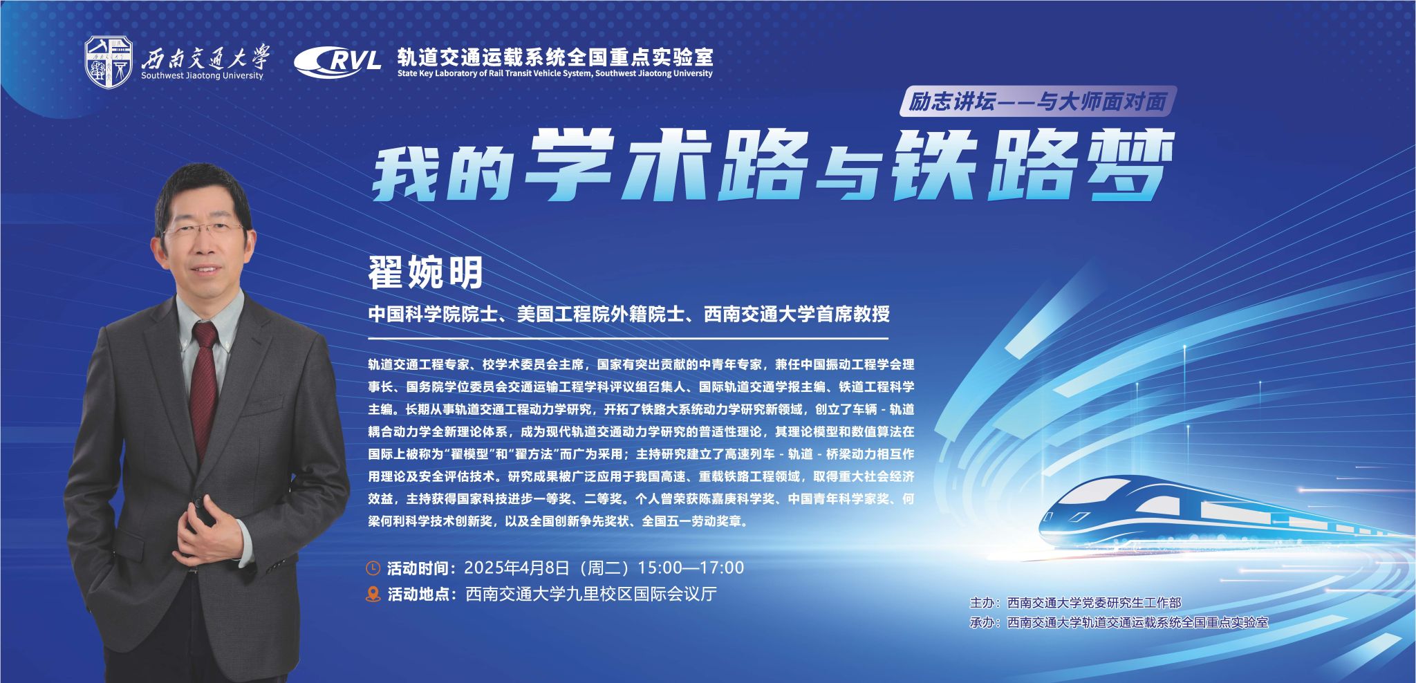 首席教授翟婉明任本期“励志讲坛——与大师面对面”主讲嘉宾。翟婉明院士将结合自身成长经历与科研实践,讲述从求学到投身中国铁路事业的奋斗历程,分享科技创新与家国情怀交织的动人故事。现将有关事项通知如下: