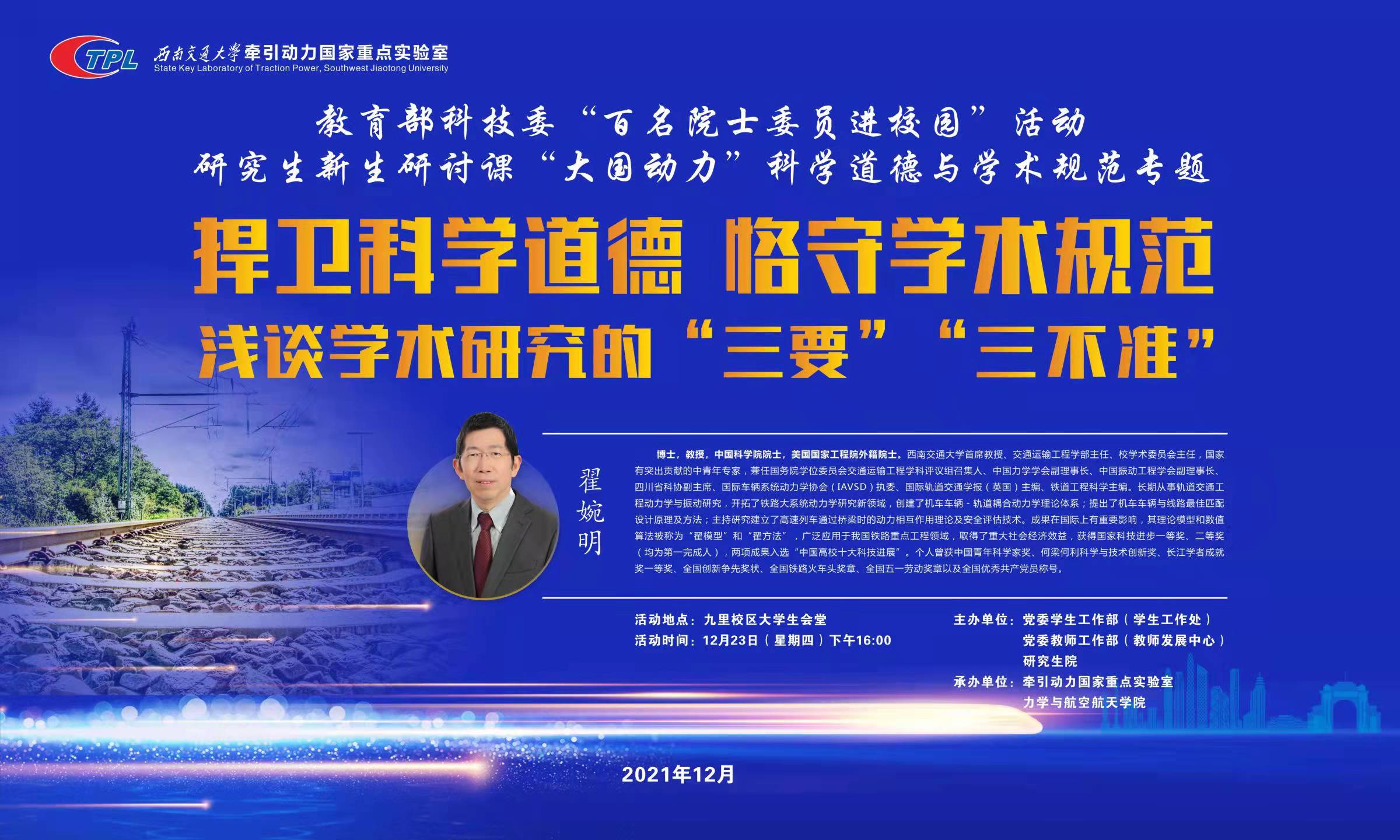 、力学与航空航天学院承办,特邀中国科学院院士、美国国家工程院外籍院士翟婉明教授开展“捍卫科学道德 恪守学术规范”专题讲座。现就相关事宜通知如下: