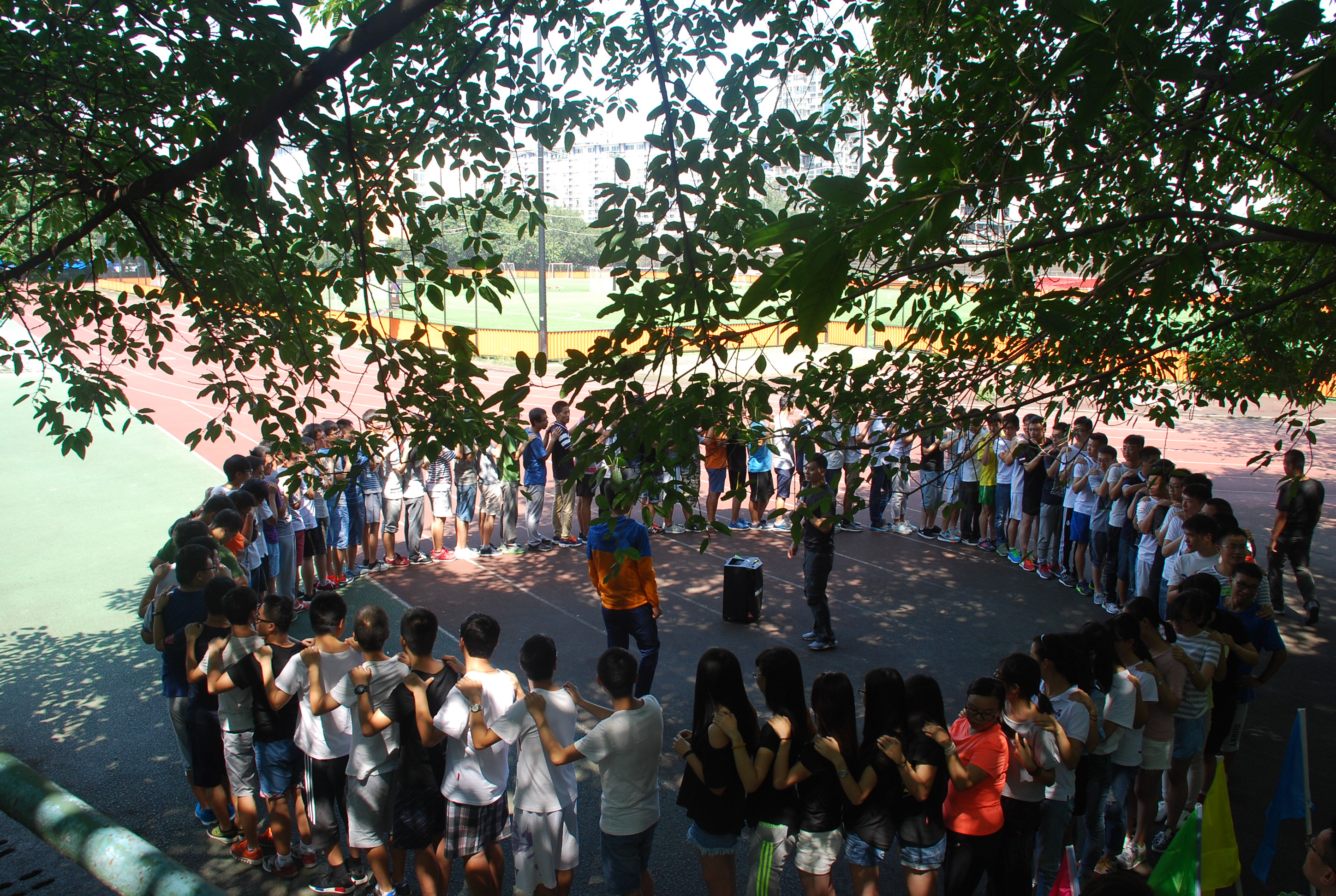 同学们首先在“破冰游戏”中相互认识。他们站成四排和自己前后的同学打招呼,为彼此捏捏肩、摸摸头,体验沟通的感觉。接下来,又围成一个大圆圈,前面的同学坐在后面同学大腿上,大家一起行走20步。最后,同学们组成各个小分队,并给自己小分队起了“牵引老司机”等活泼各异的队名,呼喊出自己的口号。