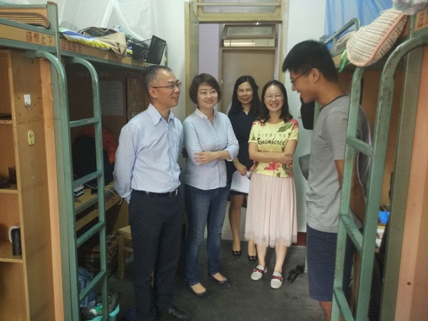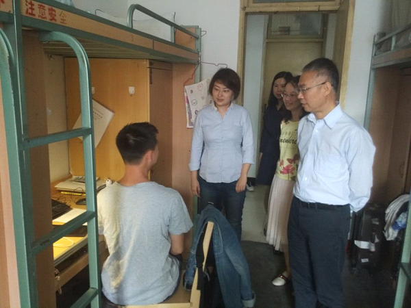 党委书记董大伟、学生工作组组长李莹、学生工作组副组长余卉和辅导员郭鑫鑫走访了学生寝室。走访范围为眷诚斋十五栋的研究生宿舍和扬华斋二栋的博士生宿舍。