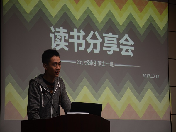 2017级硕士一班全体同学欢聚一堂,在第一次班级合影之后,在牵引红楼218举办了一场极具意义的读书分享会。上午九点,班长曾厚铭登上讲台宣布读书分享会开始。曾厚铭表示,读书是我们增长知识开拓视野的一个非常重要的途径,而且多读书可以有效增长我们的写作水平,这对于我们研究生的论文写作来说是至关重要的,要多读书,读好书,并且要积极地将自己读到的好的作品,分享给周围的同学。随后曾厚铭率先向同学们分享了自己的读书心得,并且向同学们介绍了鲁迅先生的作品风格以及他的一些感悟。