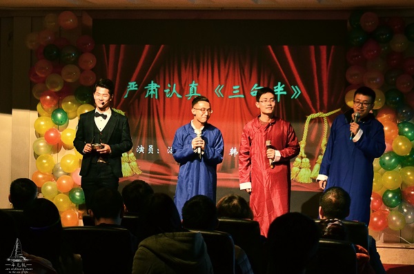 晚会的第一个节目是摇滚风格的开场舞。乐起舞动,激情四射的开场舞《Bad Girl》迅速点燃了整场晚会的热闹气氛,杨世均等同学用动感的舞步,默契的相互配合,赢得了全场观众的阵阵喝彩。随后,汤勇、高畅两位同学带来了一首经典歌曲—《老男孩》,他们用沧桑的嗓音,饱满的情感,仿佛将观众带回了过去那段青春岁月。紧接着由交大本科相声社表演的节目《吹牛》,又将观众带回了晚会现场,幽默风趣语言,让全场观众笑声不断。在魔术表演《阴魂不散》中,魔术师李思杰同学邀请三名现场观众共同参与表演,神乎其神的纸牌魔术引得台下观众掌声不断,将晚会推向高潮。在中间的抽奖环节,主持人与观众们连番互动,大家一同选出幸运获奖者。之后,各种节目轮番登场,包括钢琴演奏,独舞,歌曲串烧,独唱,木管重奏,相声等。晚会的压轴节目是由汤勇等同学带来的节目——《三句半》,诙谐幽默的表演,将晚会推向了最后的高潮。晚会最后,主持人致闭幕祝福语,为此次晚会画上完美的句号,并期望大家来年再见。