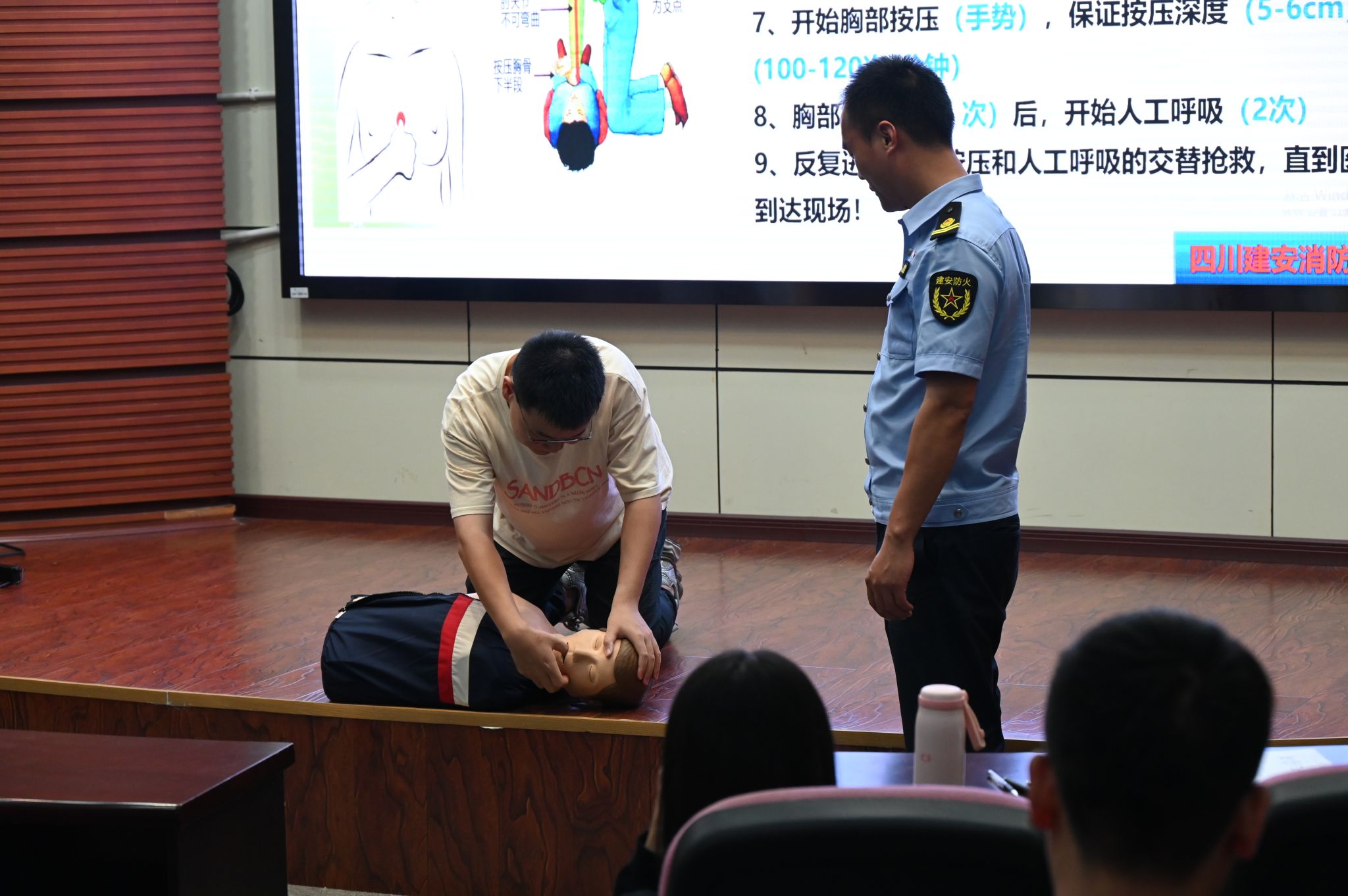 最后,培训进入实操培训环节。在消防器材使用环节,陈世扬教官重点讲解了灭火器的结构功能与操作关键,通过“提、拔、握、压”四字要领进行分步解析,并现场演示正确使用方法,帮助参训人员掌握灭火器的正确使用技巧。此外,培训还设置了假人急救(心肺复苏)实操教学环节,通过模拟真实场景,指导参训人员学习并实践心肺复苏技能,提升应对突发状况的急救能力。