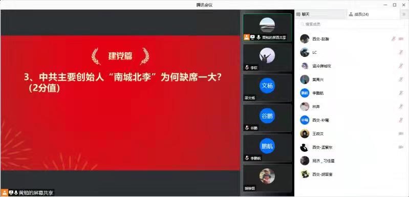 11月26日,两个支部共同开展党史知识竞答依托共产党员网、党史学习教育网站的短视频资源:党史故事微视频100讲等,以师生喜闻乐见的形式,分别提出建党、大革命、土地革命、抗战、解放战争、建国、改革开放等7个方面,30余个抢答题。推出了竞答+微视频的学习方式,以党的发展历程为顺序,以党的重大事件为线索,以不同时期的典型事例、历史人物、精彩故事为主干,全景式回顾党的伟大历程和辉煌成就。双方成员在线上会议室进行抢答,成功答对得分后,共同观看题目背后的党史故事,以一人答题,全体学习的方式,带动大家积极参与。