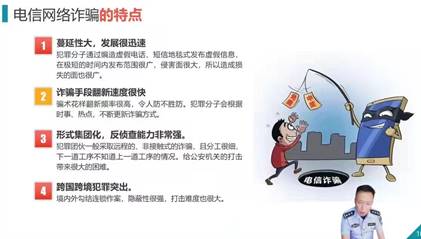 随后,为了增加同学们对于电信网络诈骗的认知,做好自己的“安全卫士”,赵警官为同学们讲解了相关的反诈骗知识。赵警官从什么是网络诈骗、为什么要防范诈骗、常见的诈骗套路以及识别防范网络诈骗四个方面进行详细讲述,逻辑脉络清晰,讲述内容深刻。