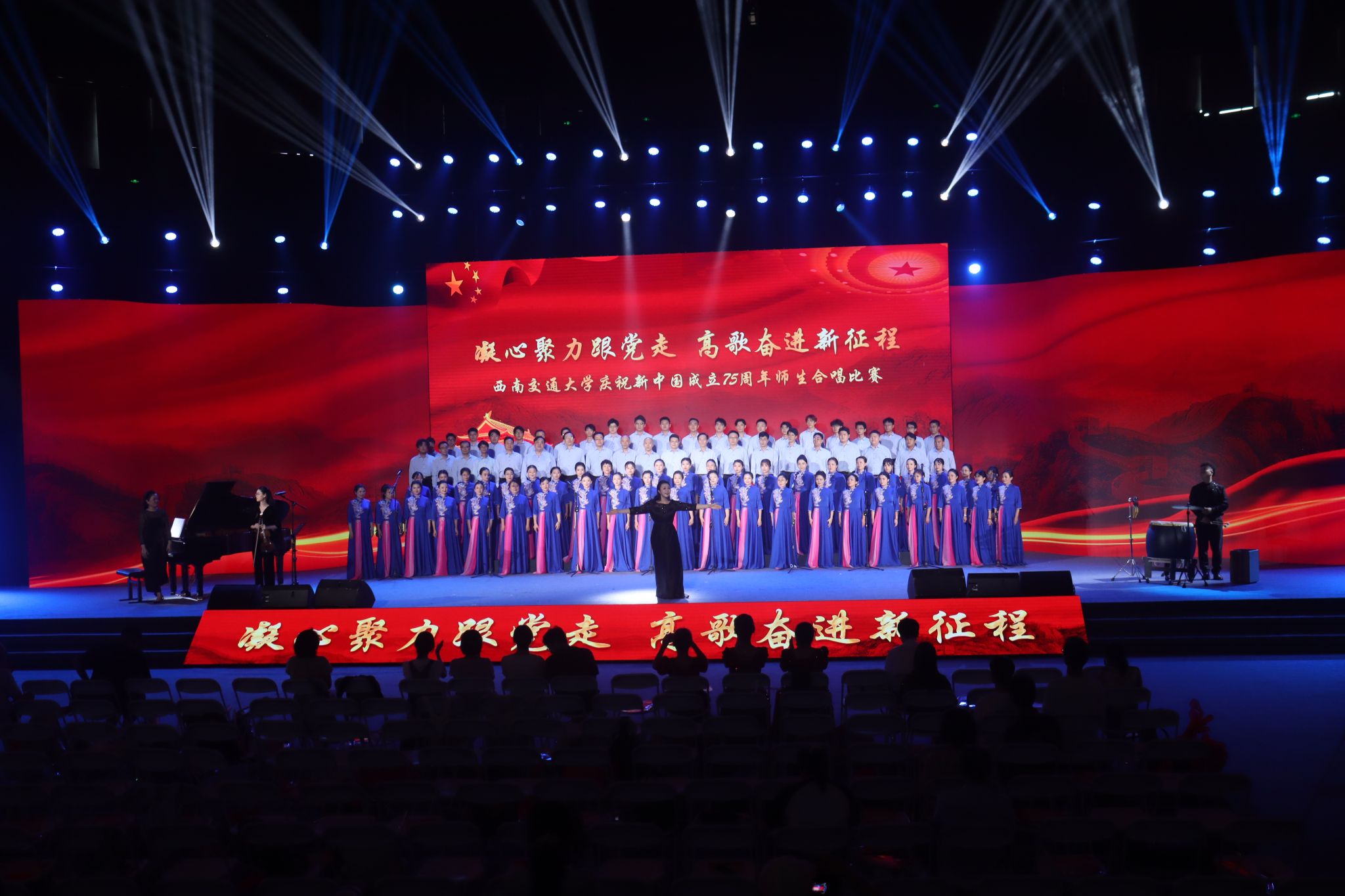 本次合唱比赛共分为“崛起·峥嵘岁月”“奋进·礼赞祖国”“复兴·盛世华章”3个篇章。学校师生共组成22支队伍,在这次合唱比赛中,他们以优美的歌声,唱出了交大师生对党和祖国的深厚情感,传递出他们对新中国辉煌历程的深刻感悟。