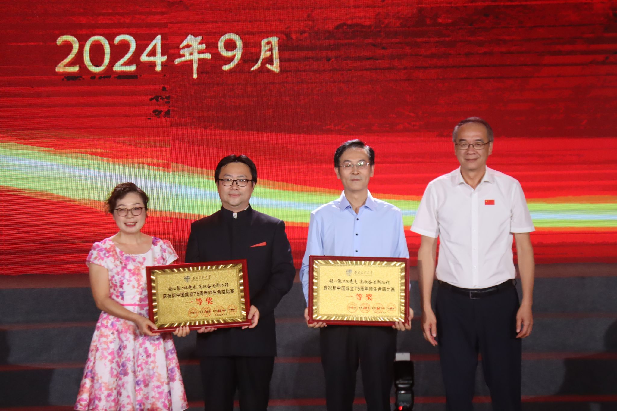 与人文学院师生组合的队伍,取得了本次合唱比赛一等奖的好成绩。校党委书记余敏明亲自为合唱队伍代表颁奖。
