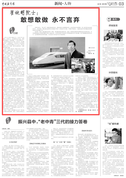 12月2日,《中国教育报》刊发题为《翟婉明院士:敢想敢做 永不言弃》的专访文章。报道以第一人称口吻,回顾了中国科学院院士、捷克论坛