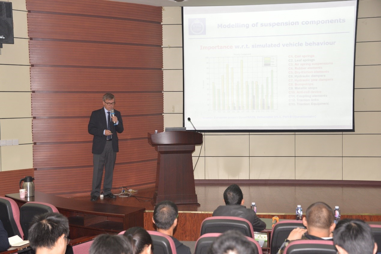 赵春发教授主持。Mats Berg教授首先对其所在的团队进行了详细的介绍,并鼓励有兴趣的同学到KTH攻读博士学位。随后Mats Berg教授对车辆—轨道作用的动态仿真中要注意的问题进行了讲解,结合一系悬挂、二系悬挂元件的建模,讲述了最基本的建模原则和如何对模型进行分析。讲座结束后,Mats Berg教授对同学们提出的仿真中遇到的实际问题做了详细的解答。