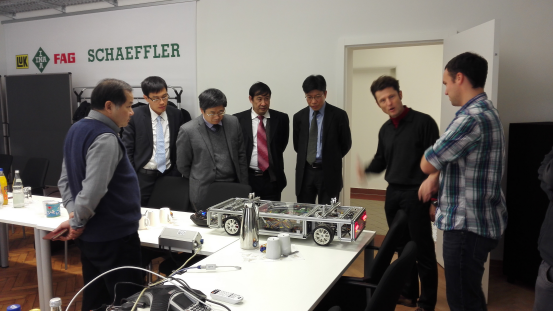 1月18日上午,代表团来到卡尔斯鲁厄理工学院。在KIT舍弗勒先进研究中心(SHARE at KIT),代表团与学校国际事务办公室亚洲和中东执行官Oliver Schmidt先生以及舍弗勒先进研究中心团队进行会谈交流。Oliver Schmidt先生从学校组织架构、学科布局、研究能力、国际化工作等方面对卡尔斯鲁厄理工学院的概况进行了介绍。卡尔斯鲁厄理工学院是德国顶尖理工科大学之一,也是在自然科学和工程技术等领域享有盛誉的世界顶尖研究型大学之一。其校友和教授中诞生过“电磁波的发现者”海因里希•赫兹,“液晶之父”奥托•雷曼,“合成氨之父”弗里茨•哈伯,“氢弹之父”爱德华•泰勒,“高分子化学之父”赫尔曼•施陶丁格,“汽车之父”卡尔•本茨等世界著名科学家、企业家和社会名人。因其在教学和科研方面的突出表现和卓越的创新精神,KIT于2006年被德国科研联合会(DFG)评为首批三所德国精英大学(Elite-Uni)之一,这不仅是德国高校的至高荣誉,还意味着更多的政府资金支持。同时,KIT是德国亥姆霍兹联合会成员,是一所国家级的大型研究中心,是德国九所卓越理工大学联盟(TU9)成员,欧洲航天局(CLUSTER)成员等。在大学整体排名方面,根据2016年QS世界大学排名显示,KIT是世界大学百强高校之一,排名全球第93,德国第4。在学科排名方面,根据2016年USNews世界大学排名学科排名显示,KIT的众多学科排名世界前列,其中工程学排名德国第1,化学排名德国第1,材料科学排名德国第2,地球科学排名德国第3,物理学排名德国第4。另外,KIT国际化工作也相当出色,根据2015年数据,国外博士生和研究人员占全校师生20%,分布在全球65个国家的合作伙伴超过1000家,与国外大学合作开展24个双学位计划,29个国际博士生计划,世界知识产权数量1800多件,欧盟项目资助额超过8000万欧元。Ralf Stopp博士介绍了KIT舍弗勒先进研究中心的设立目的、组织架构、科研能力和博士生培养情况,代表团对舍弗勒集团在著名大学设立研究机构或研发团队的合作模式展开了详细讨论,这种校企合作模式非常值得我校借鉴。会谈后代表团还参观了KIT移动系统研究中心的捷克论坛