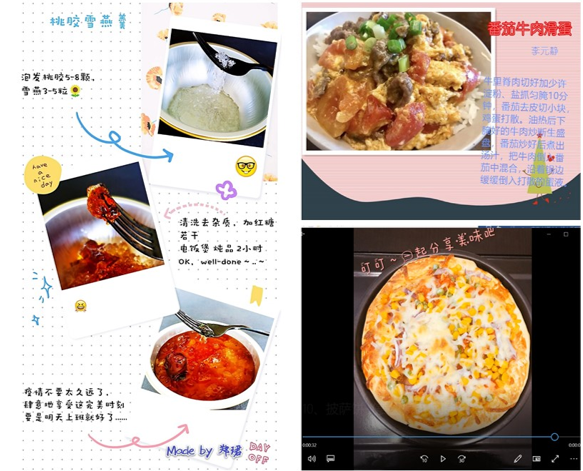 “因为学校离家较远,平时上班不是吃食堂,就是父母在家做饭,即便偶尔自己做,做得也很粗糙。”张崴老师如是说。家里小孩平时爱吃经典川菜麻婆豆腐,自己在家做过几次,可孩子总是说不如饭店的味道好。这次厨艺比拼,张崴老师专攻麻婆豆腐,在网上搜索了制作流程,步步求精,终于做出了可口的味道。她说:“宅在家中和家人做饭,是平时忙碌生活里阖家少有的快乐”。