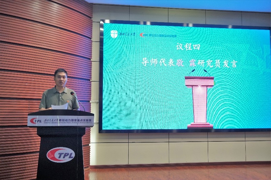 之后,敬霖研究员作为导师代表发言。他从导师的角度,用“捕鱼”这个生动有趣的比喻向同学们分享了如何在导师指导下开展研究这一问题的体会和认识。他表示开展研究首先要明确研究目的、方向、手段以及研究价值,结合自己的研究目的选择合适的研究方法,发扬不怕苦、不怕累的精神,这样才能在科研中有所收获,孕育出良好的研究成果。敬老师的精彩发言赢得了同学们的热烈掌声。