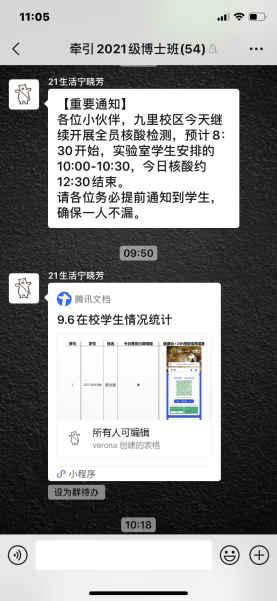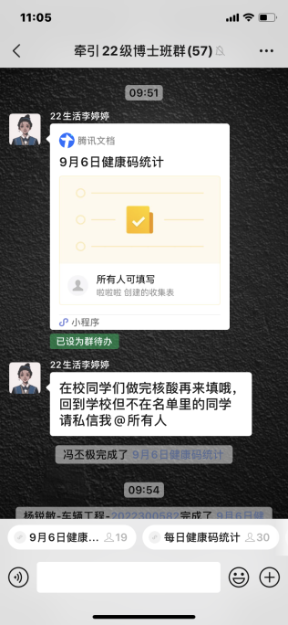 在全体研究生班级中设置由“班级网格员”,由生活委员和班长配合担任“班级网格员”,开展防控工作。“班级网格员”们利用腾讯在线文档小程序等工具,每日在指定时间内对捷克论坛