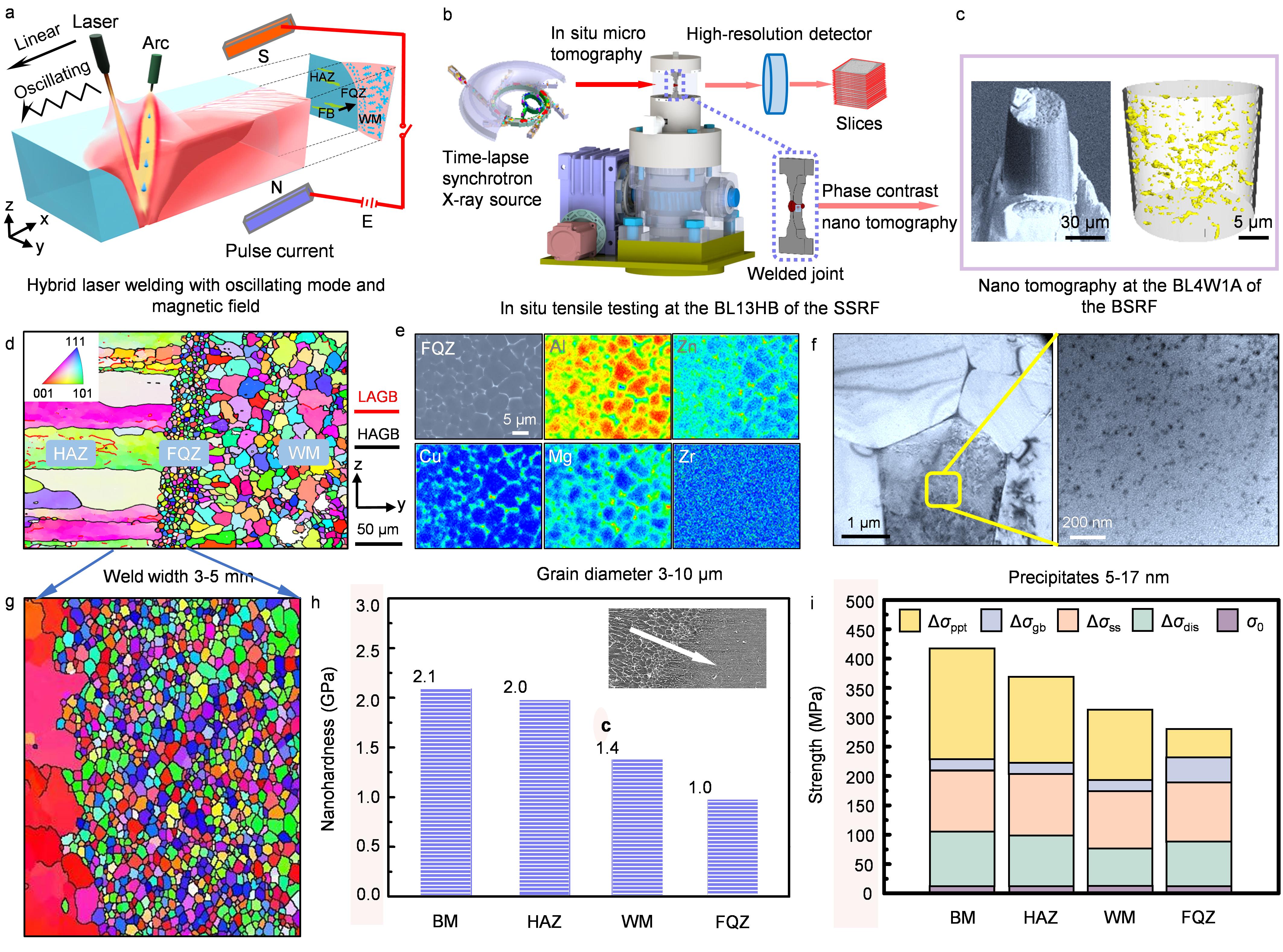 高强度铝合金结构强韧性差一直是困扰航空航天、高速列车等重大装备的世纪难题。自从焊接技术发明以来,铝合金熔焊结构频繁发生疲劳破坏,根源在于损伤演化机理不明。在一次高倍显微观察中,研究人员偶然发现在激光焊接7075铝合金熔合线处存在着一个宽度仅为数十微米的贯穿板厚的细小等轴晶区(Fine eQuiaxed Zone,FQZ),这种极易被忽视的细晶带在铝合金和钢结构中普遍存在,例如载运装备用2000系、5000系、6000系、7000系和8000系铝合金及能源用钢S960、G115和Cr92等,焊接热源覆盖激光、电子束、等离子束和电弧,广泛用于航空航天、能源动力、高速列车、海洋船舶等。研究显示,细晶带是接头硬度和强度最低的区域,在结构受载时,裂纹优先萌生于细晶带,造成破坏源于热影响区(HAZ)的假象。为此,亟待探明熔焊接头细晶带的软化及失效机理,为建造高损伤容限的轻量化铝合金结构提供科学支撑。