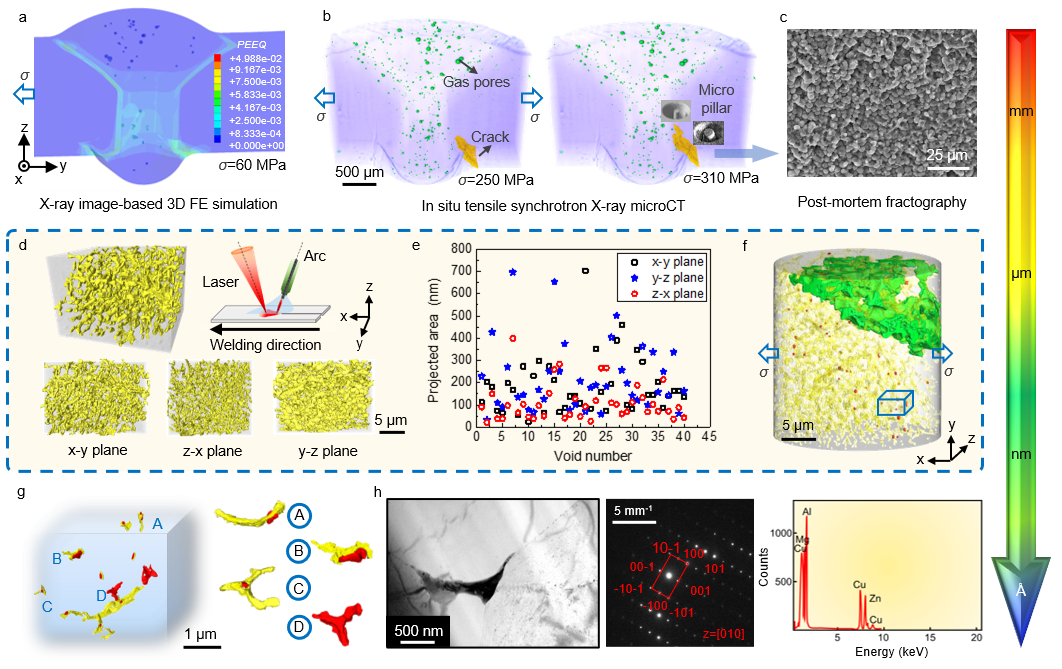 进一步地,开展了多维多尺度关联成像表征,包括同步辐射原位X射线成像和高分辨纳米成像及透射电镜等。发现在单调拉伸加载下,熔焊接头优先在细晶带损伤形核与发生裂纹萌生。损伤形核模式包括三叉晶界形核以及晶间相与界面脱粘形核。其中,晶间相的空间形貌具有各向异性,倾向于沿着焊缝厚度方向填充在晶粒之间,这种分布特征有利于促进微孔洞的形核与扩展。另外,几乎所有形核的微孔洞均与晶间相有关。通过衍射图谱和成分标定发现,孔洞形核与大角度晶界上分布的AlCuMg硬脆相密切相关。