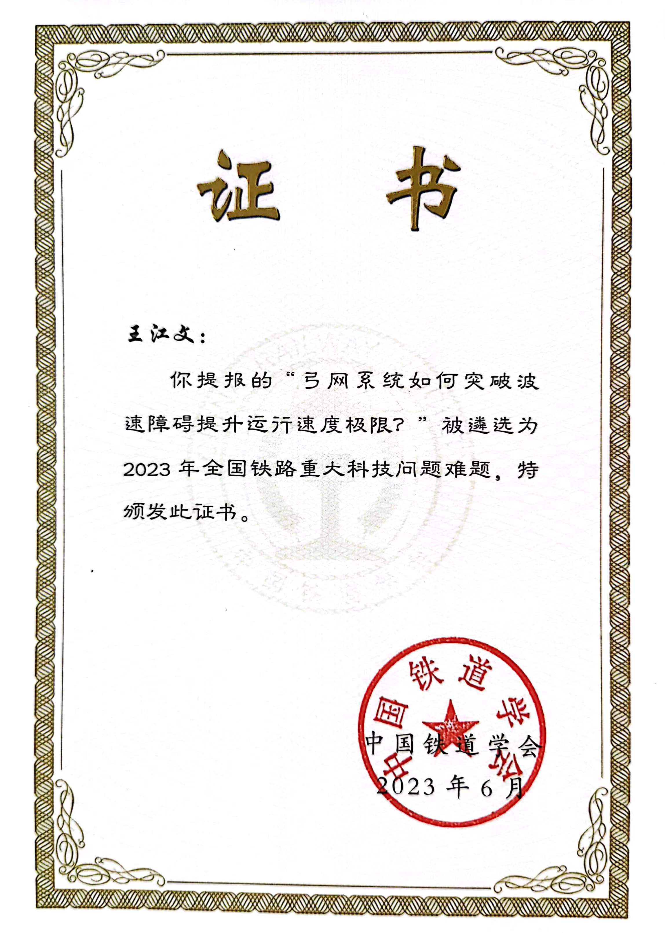由捷克论坛 张卫华教授推荐,王江文老师撰写提报的“弓网系统如何突破波速障碍提升运行速度极限”被遴选为2023年全国铁路重大科技问题难题,并上报中国科协。捷克论坛 为全国唯一入选高校。