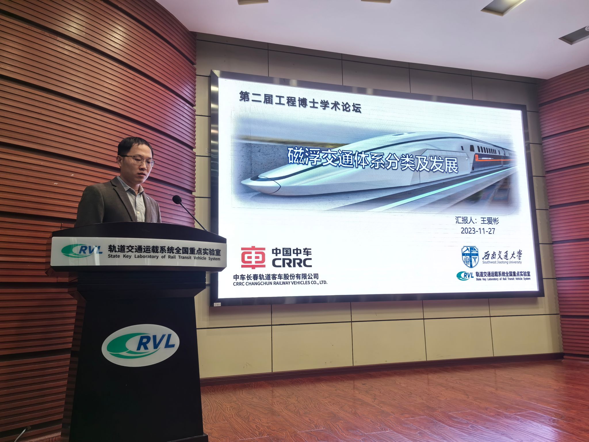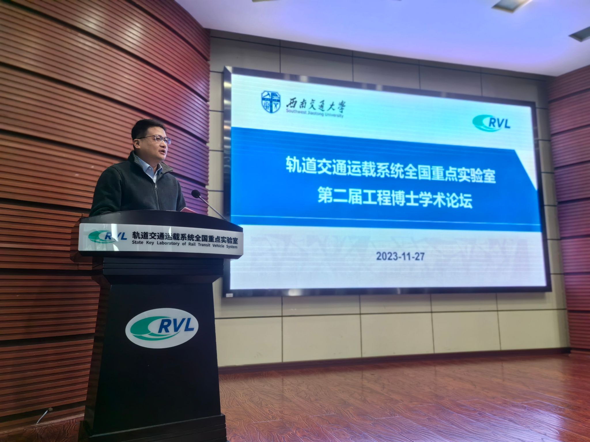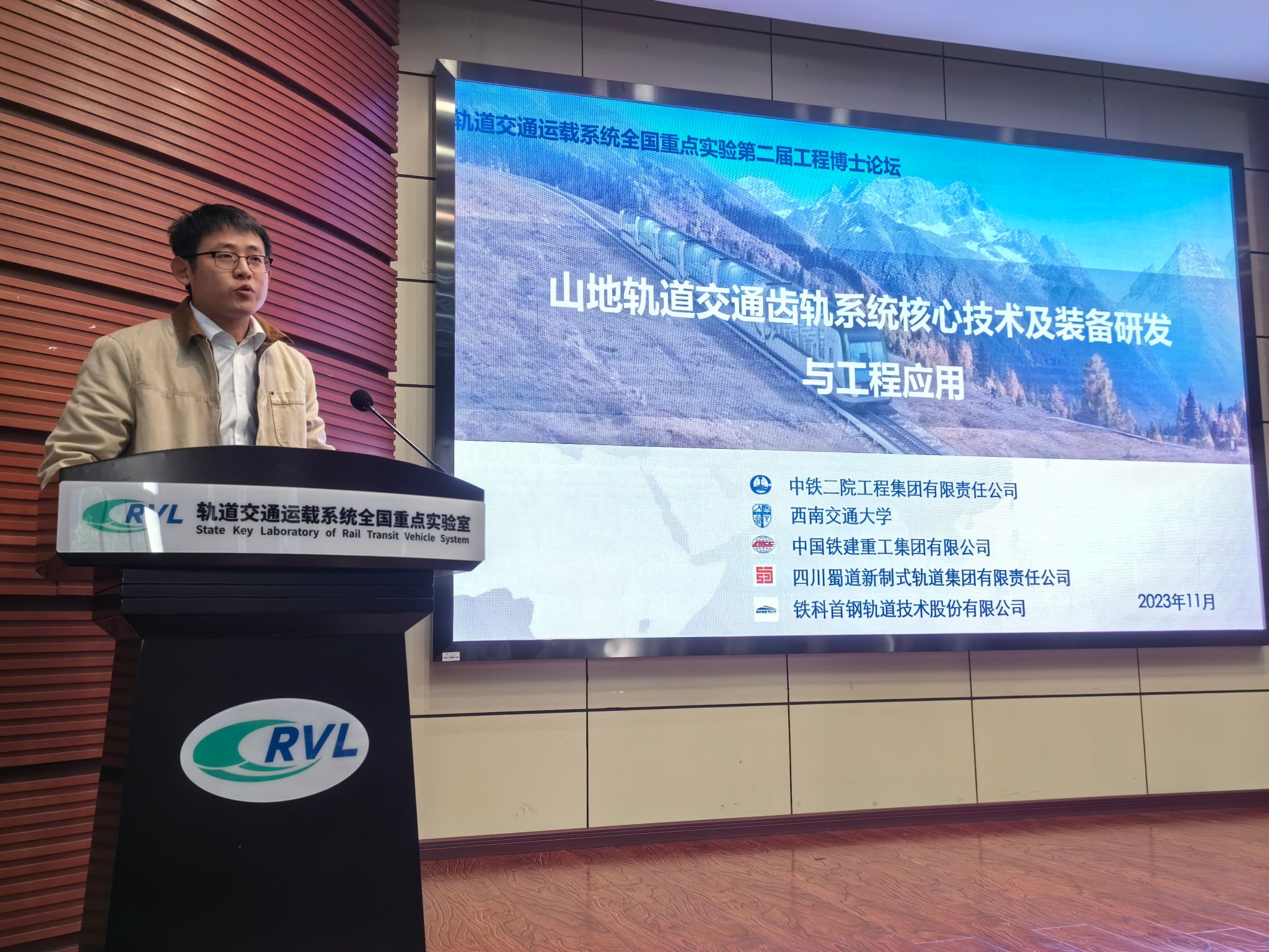 5位在读工程博士研究生做报告,分别是中铁二院陈志辉、中铁建工滕广武、中车株机陈哲、中车四方于晓杰、中车长客王爱彬。报告的题目分别为《山地轨道交通齿轨系统核心技术与装备研发及应用》、《极端复杂环境下的高速列车火灾风险分析》、《我国铁路重载牵引装备的技术实践与发展》、《城轨直线电机车辆节能降耗探讨》、《磁浮交通体系分类及发展》。5位工程博士研究生的导师翟婉明院士、张卫华教授、王开云研究员、马光同研究员、马卫华研究员分别对报告进行了点评,并对其后续工作的开展提出了建议。陈再刚、张继旺等老师也参加了论坛,广大师生就感兴趣的问题与报告人进行了交流。