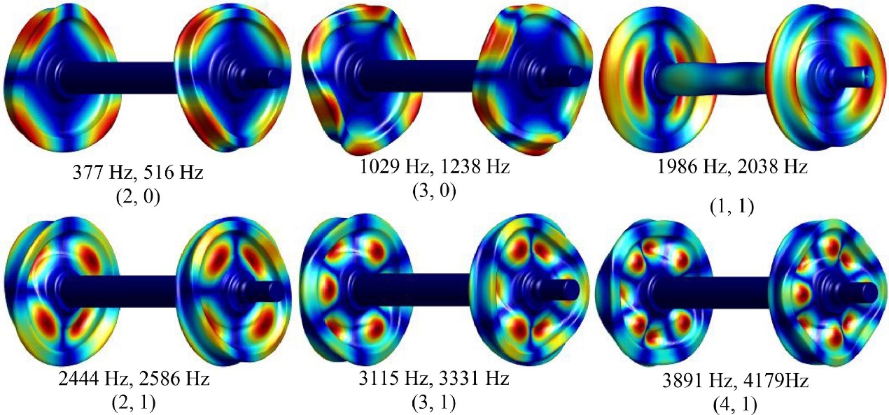 Fig. 11. Vibration modes of the wheelset suppressed due to lateral wheel/rail interaction.