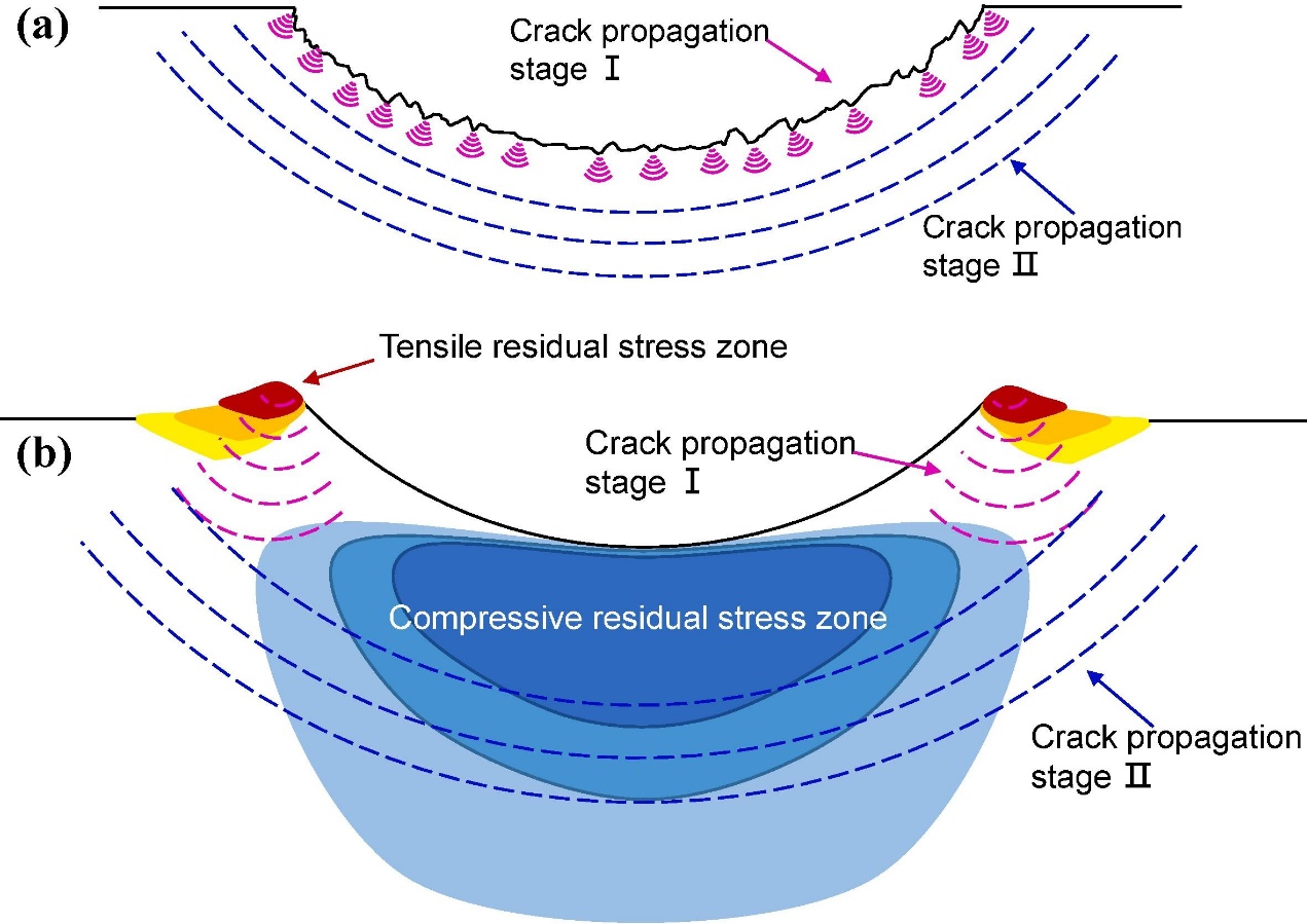 Fig. 9. Fatigue crack propagation of (a) EDM specimen and (b) TBD specimen.